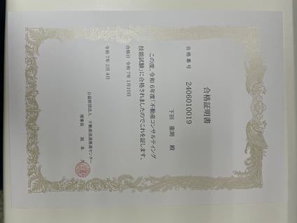 不動産コンサルティングマスターの試験を受けていまして、無事、合格することができました。 これからも研鑽を重ね、不動産に関することで還元できるよう頑張ります。